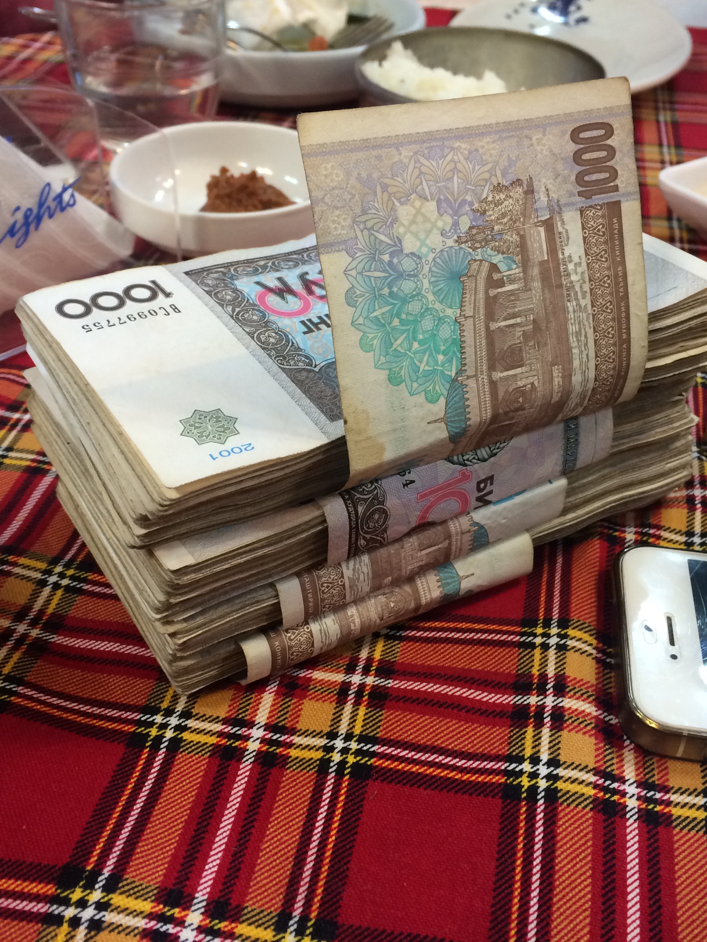 - When the official exchange rate is approximately 2,350 soms to one U.S. dollar, the ensuing stack of cash when 13 people pay a restaurant bill makes one feel rich!