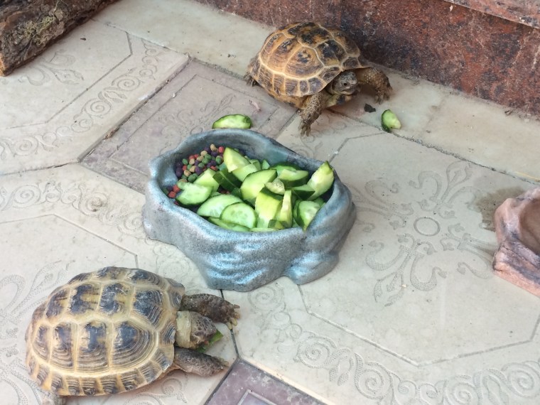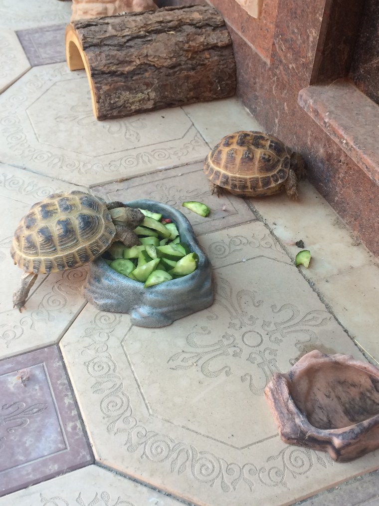 Then we went on to an open-air bazaar where I picked up another tortoise. This time I made sure it was definitely a male, to keep her company. One of my neighbors picked up two tortoises also, and to our horror all three were shoved into a teeny box where they tried constantly to scratch their way out until we arrived home! Another neighbor had to turn down an adorable kitten that kept being foisted on her by an elderly Russian-speaking woman who repeated in English, “Little cat! Little cat!”