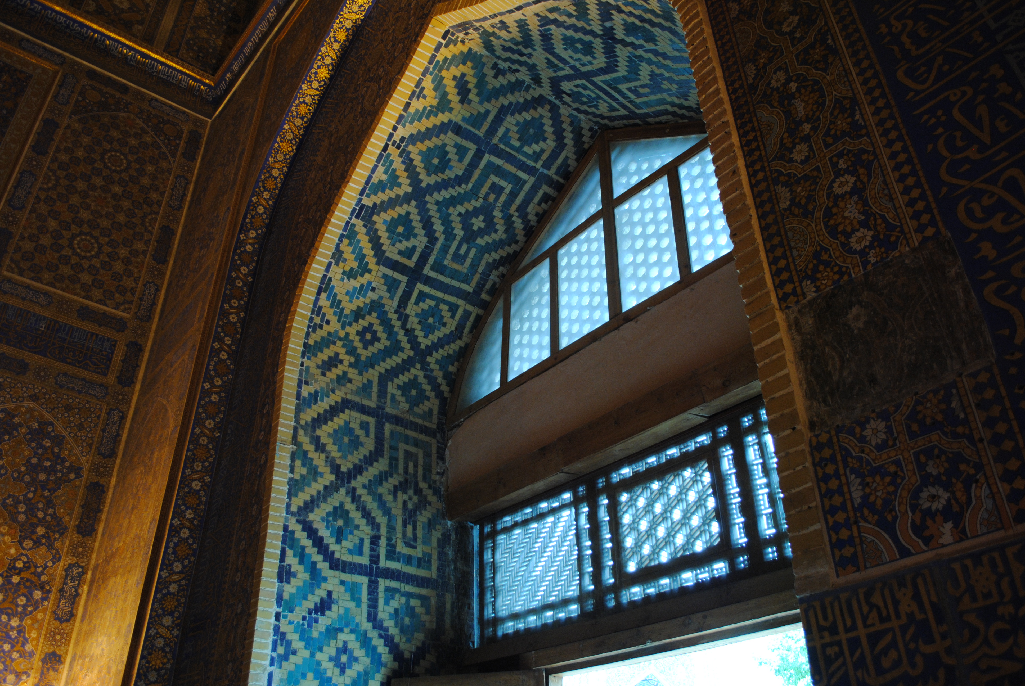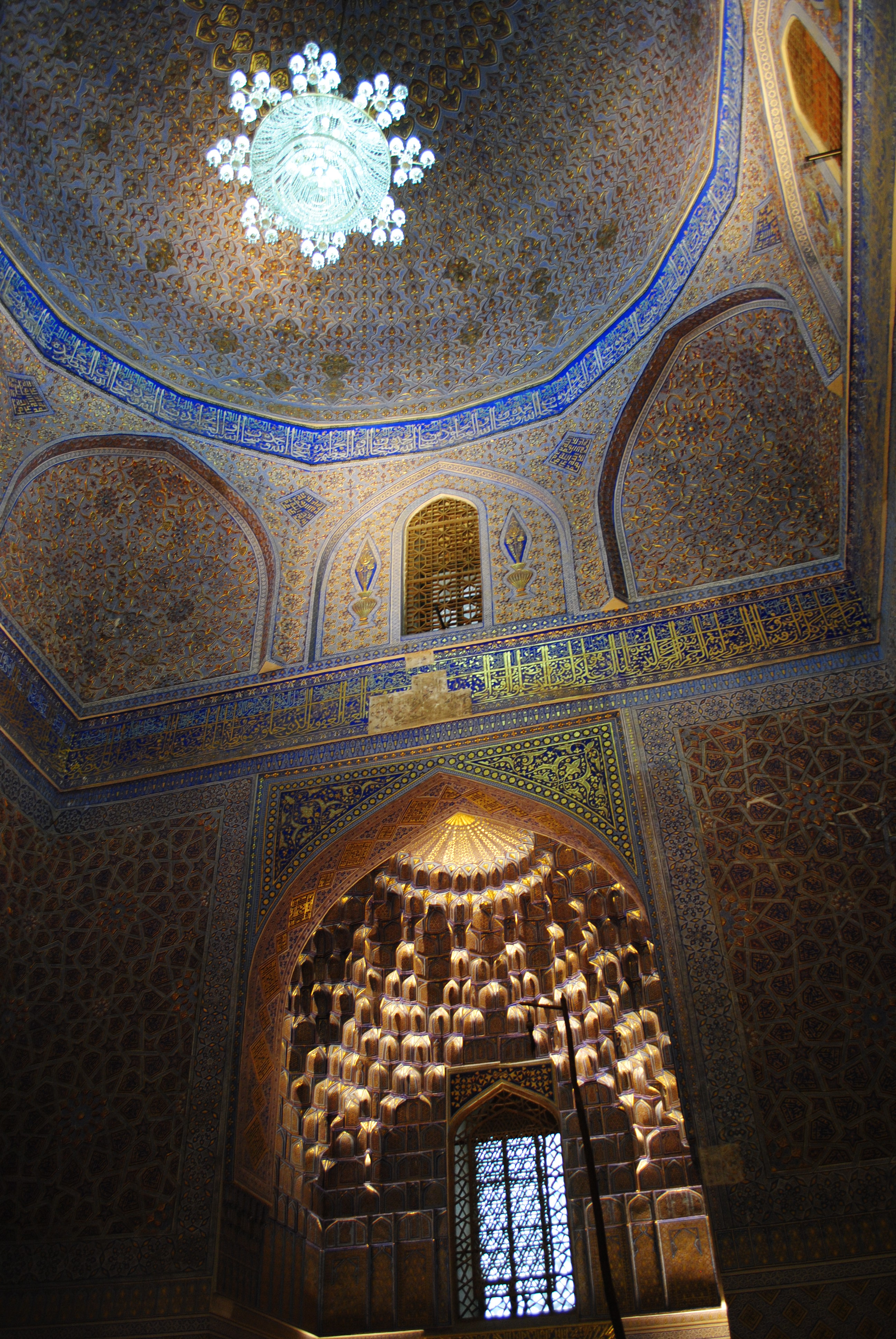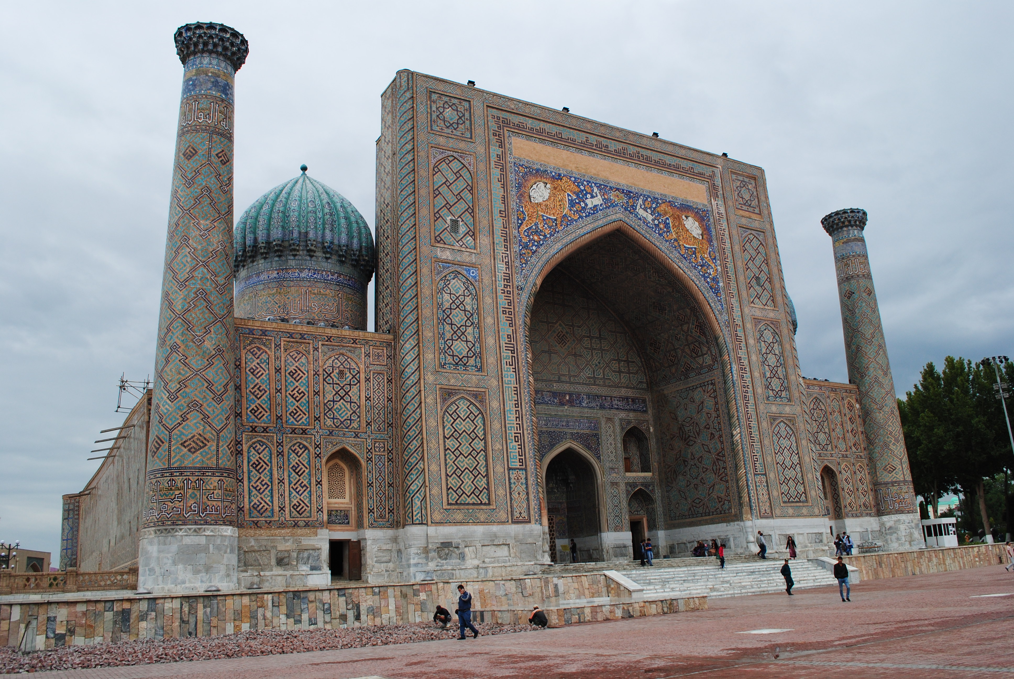 V in front of the Tilya-Kori Madrasa (1646–1660). The original dome collapsed in an earthquake and was reconstructed sometime in the 1900s. It arguably has the most beautiful interior.