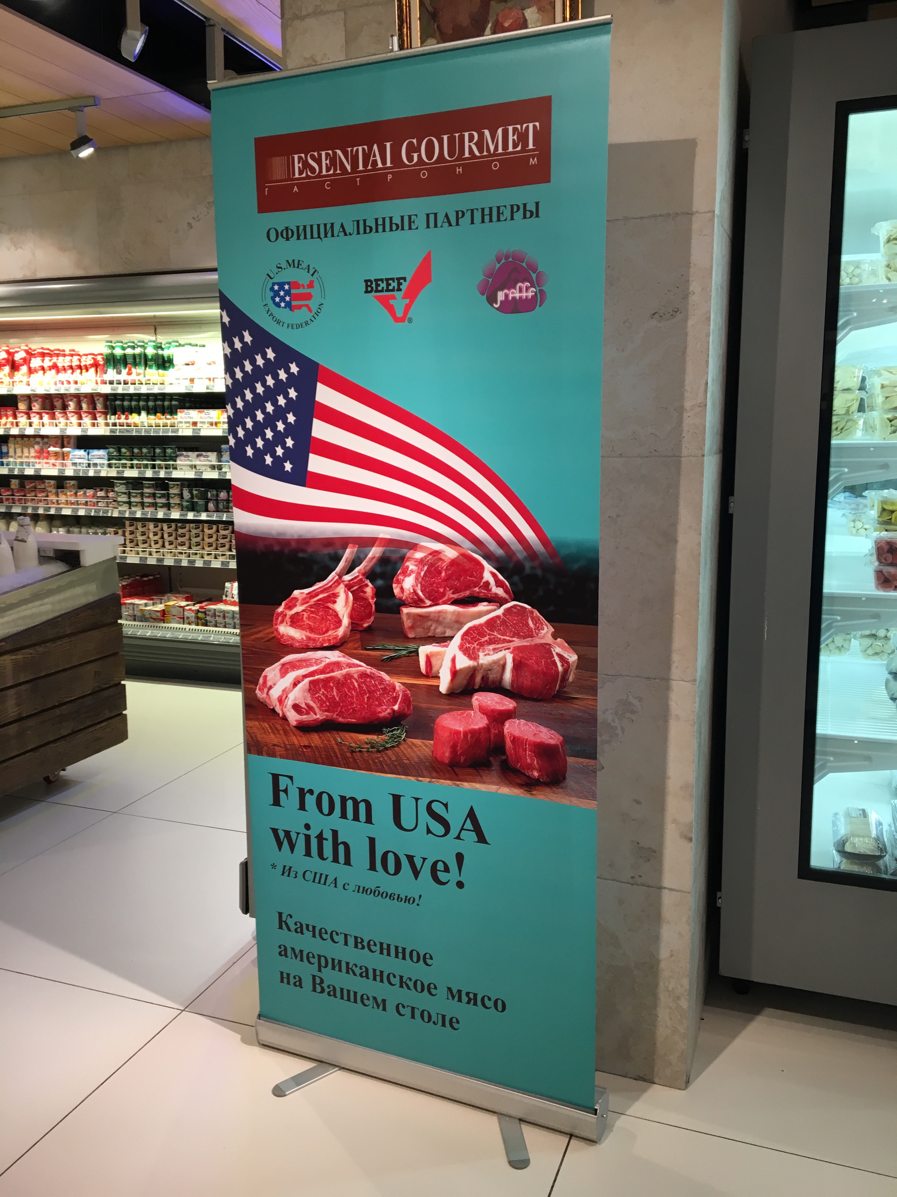 On Sunday we braved a second day of heavy snow and walked around the Esentai next door to the Ritz. As the store selection was more Gucci, Saks, Jimmy Choo, and Valentino than it was Nordstrom, Sephora, Macy’s, and Bebe, we didn’t buy anything. However, we absolutely marveled at the gourmet grocery store in the basement. I have to say that it rivals any upscale grocery store in the U.S. and bests many of them. I was floored by the displays, the prices, and the overwhelming foreign selection of, well, everything, including a partnership for imported American beef.