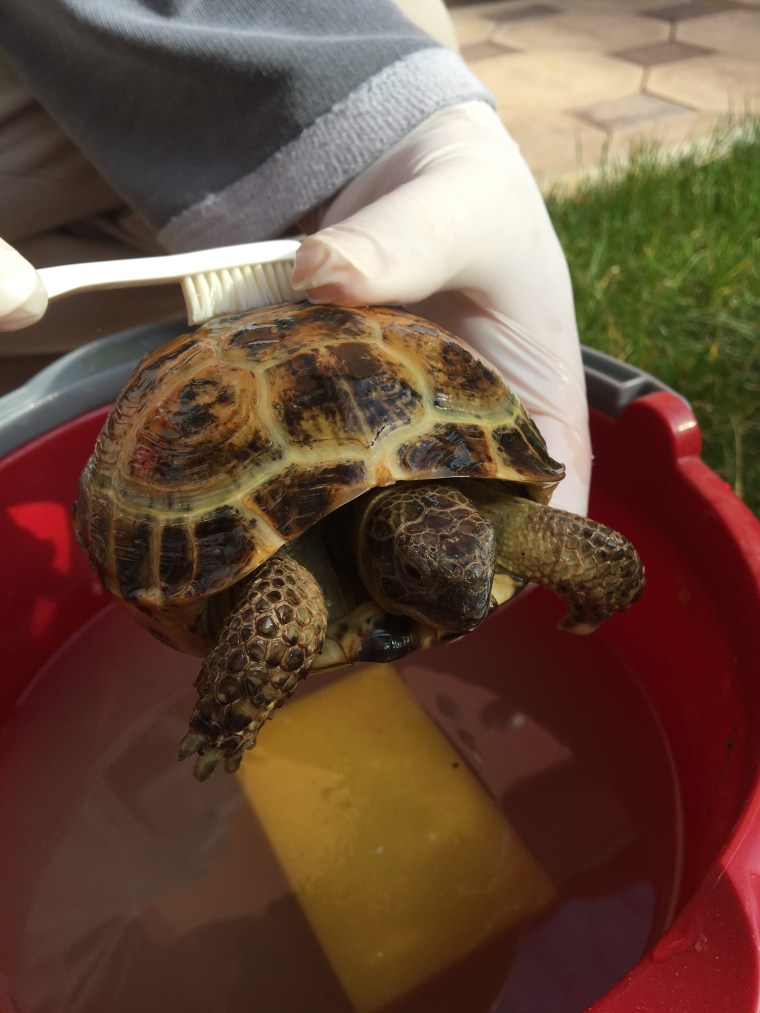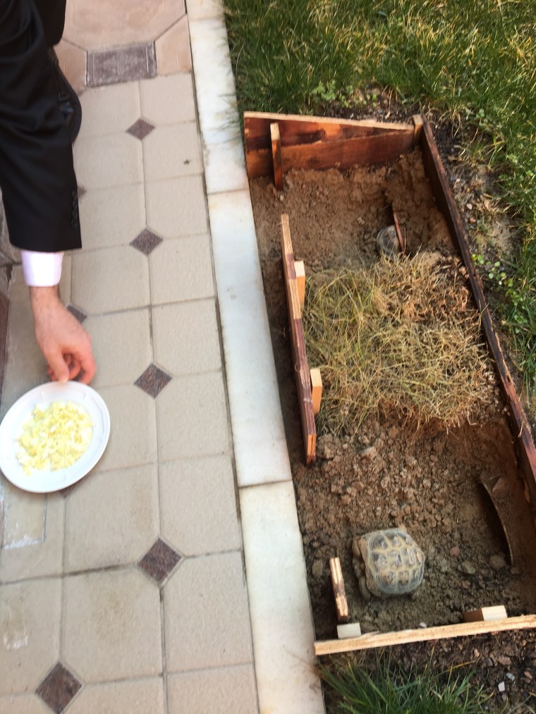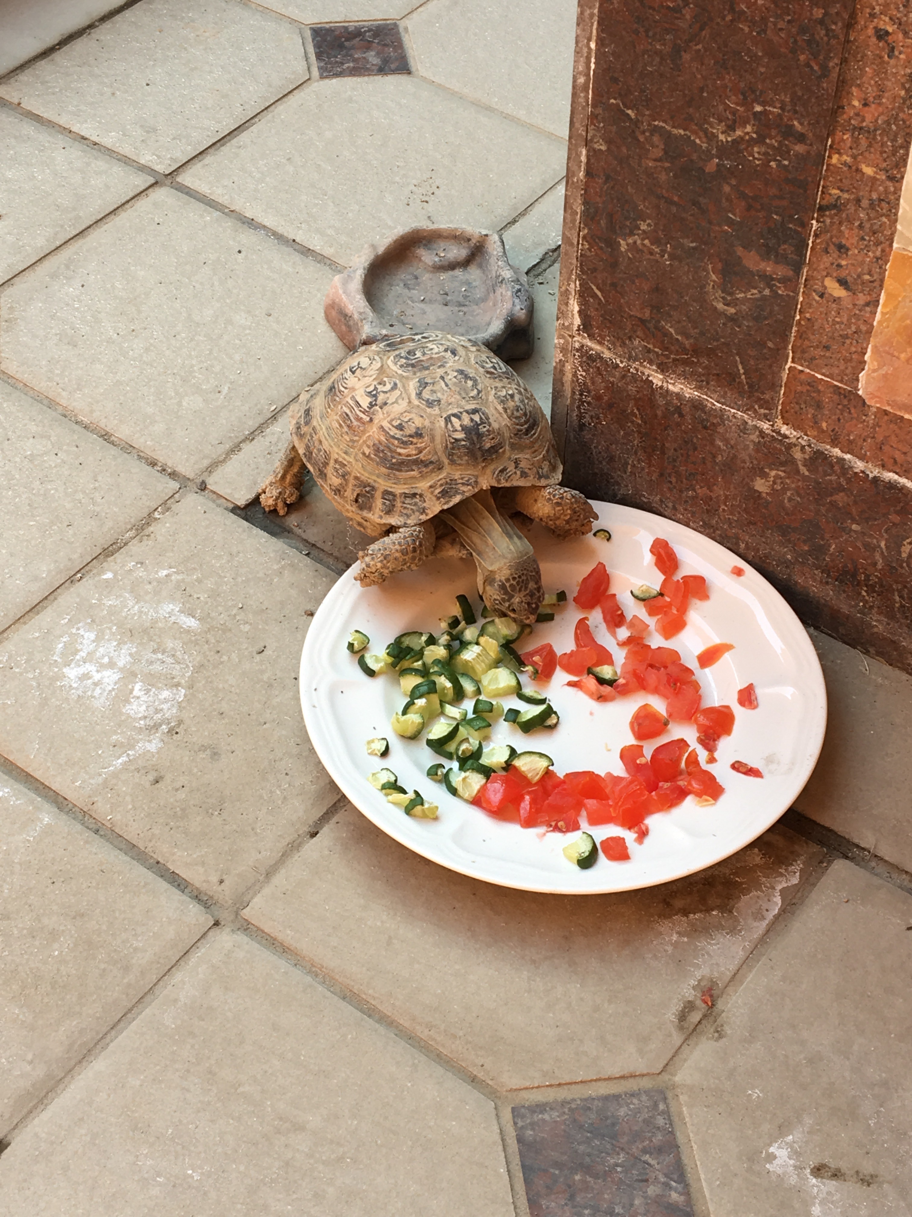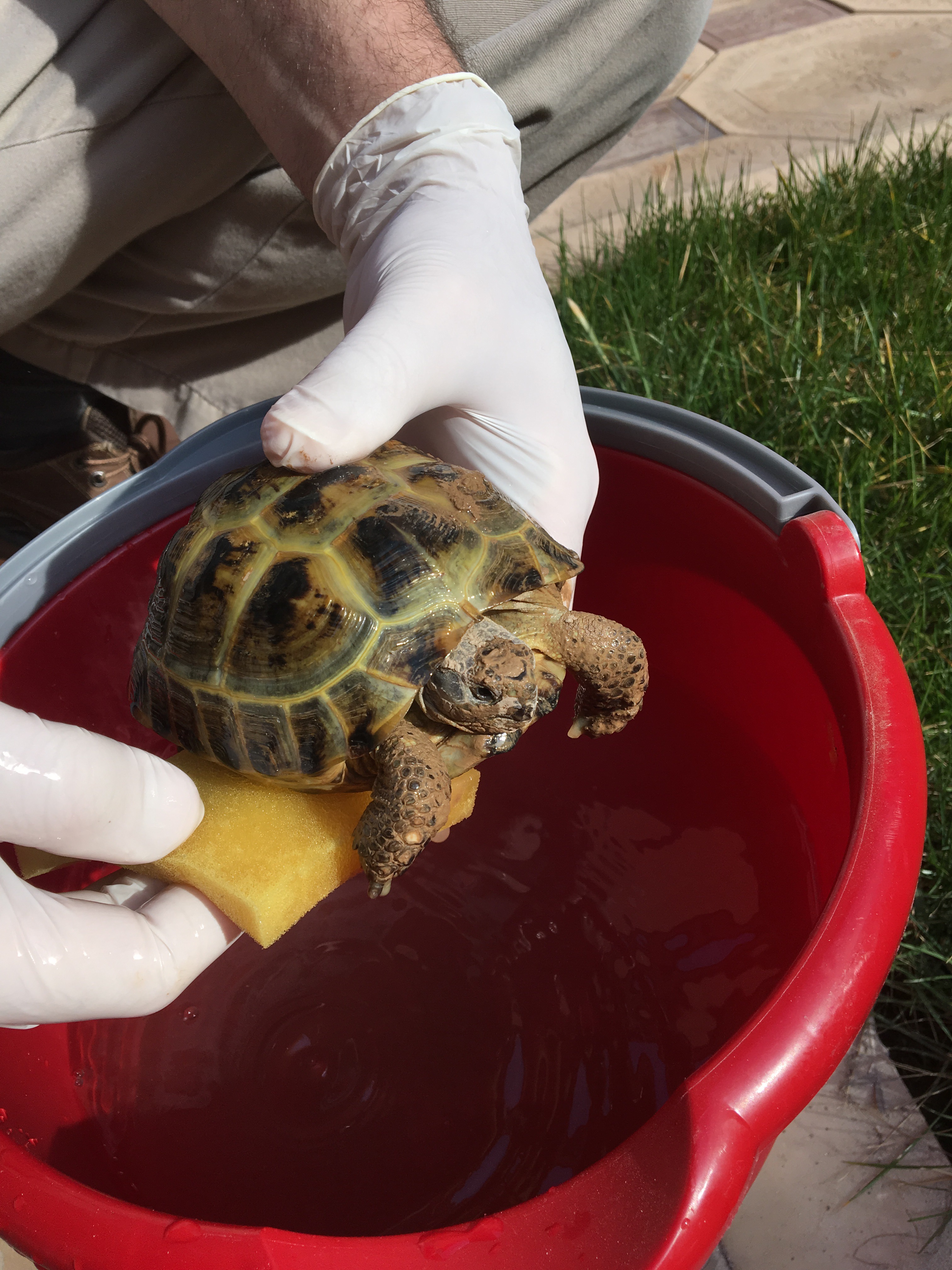 ArslanaAfter the tortoises dried off, we put them in a sideways box and they nestled into a towel and fell back asleep. I’m really happy to look out the window and see them trundling around the yard. It feels like they were gone for a long time.