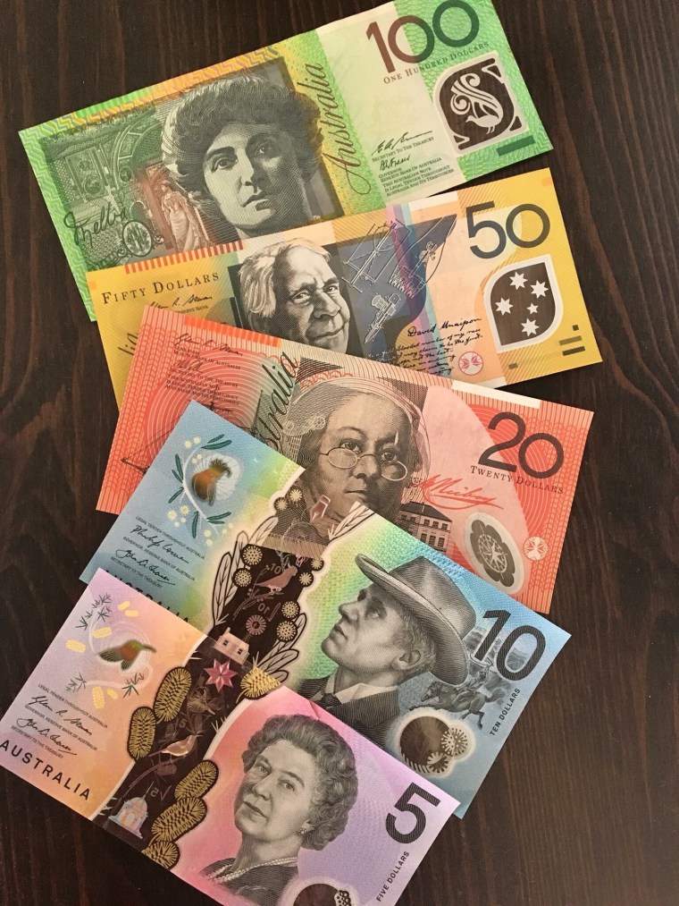 When I first moved to Australia in 2005 and exchanged my U.S. dollars and euros for Australian dollars, the first thing I noticed was how beautiful they were. Australian paper money looks and feels different than American paper money for three main reasons: the denominations are different colors, they vary in size, and for approximately the last thirty years, all the notes have been polymer. The plasticization, clear windows, and other security features make these banknotes almost impossible to counterfeit or rip. Currently an Australian dollar is worth 78 U.S. cents. When deciding whether or not to make a purchase, I mentally do the currency conversion by slashing 25%. That helps me see if the item’s price is fair or “worth it” to me. Despite the sticker shock that Americans legitimately feel with the smaller dollars and generally higher prices here, the colorful money is delightful.
