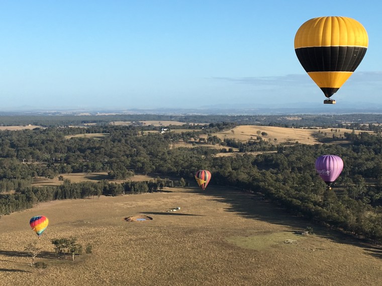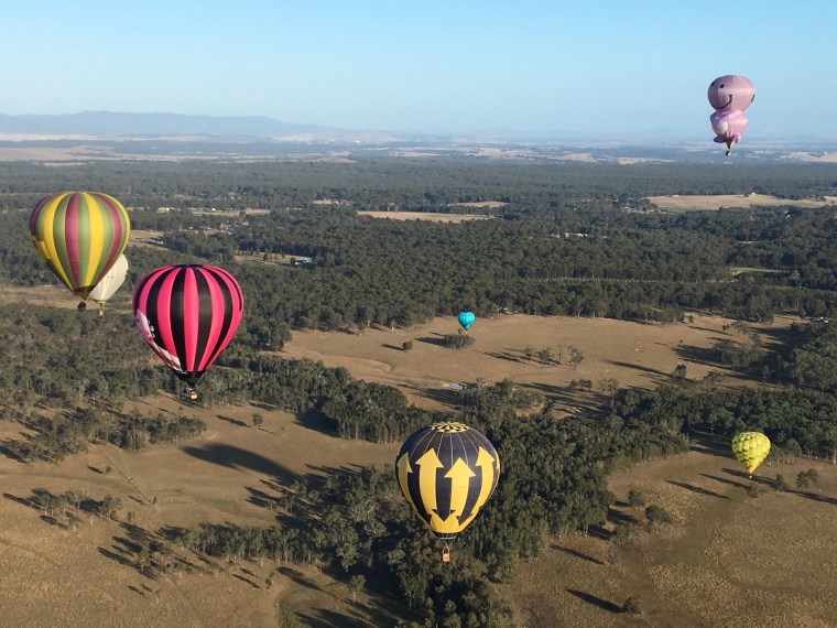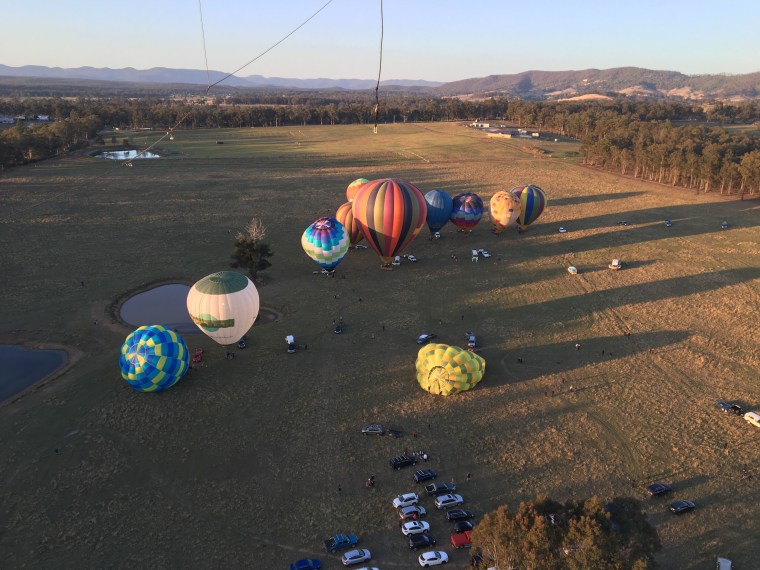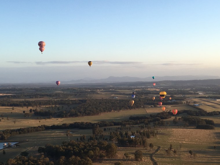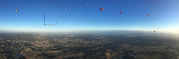 The basket was divided into 4 quadrants with a separate section in the middle for the pilot and equipment. V and I were on the end of our compartment away from center, and I was right at the edge. Strangely enough, I looked straight down from the highest point and told myself everything was all right, and my fear subsided. I thought of my scary half hour drive home from the restaurant the preceding evening, where no streetlights, kangaroos my size grazing right at the edge of the narrow highway, and hairpin turns all had me holding my breath. That was *way* more unsafe than this, just less novel, my right brain announced.