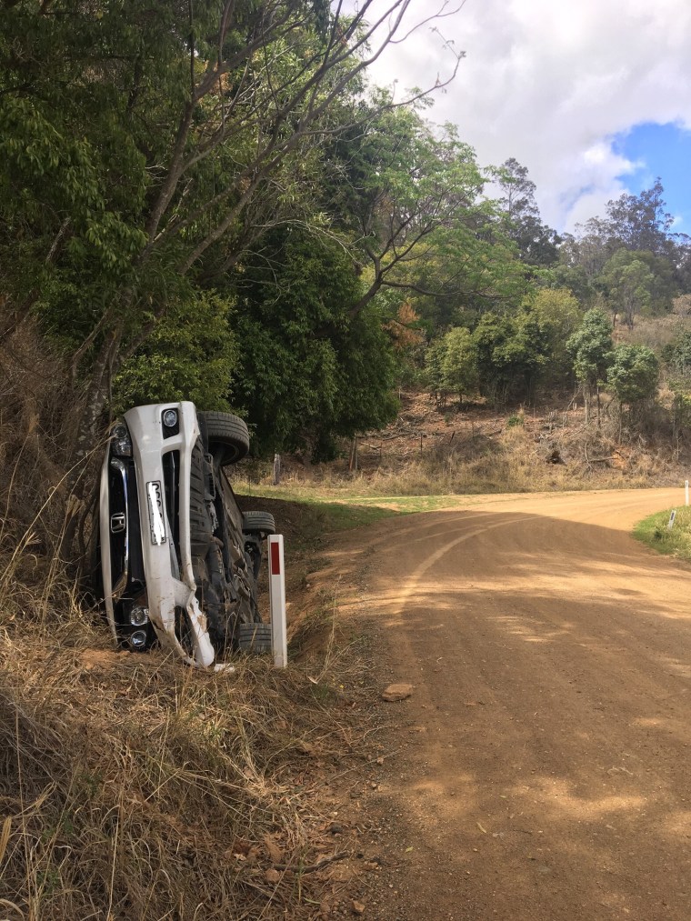 The young couple from the truck approached cautiously. “This wasn’t here last night,” the guy said. “That’s what we were saying.” He climbed around the trunk, looking for a way to the driver’s side leaning against the hill in a ditch. Just as I was thinking to call triple-zero (Australian 911), I noticed a thin strip of white and blue checkered NSW police tape tied around the rear left wheel spikes. “It’s marked,” I said with relief. “The police have already been here.”