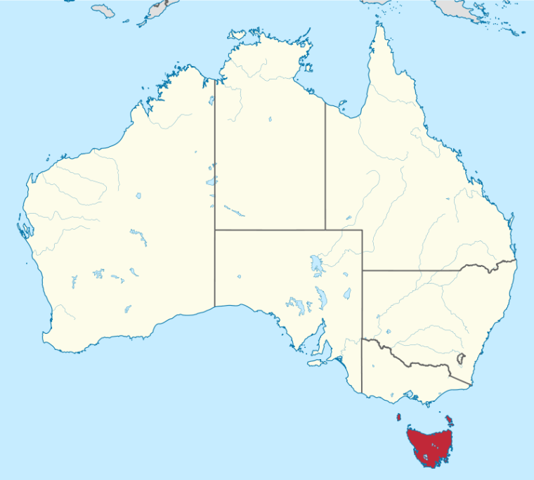 Located a couple of hundred miles south of the Australian mainland, Tasmania is Australia’s island state (in red, below).