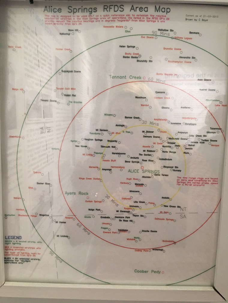 The base in Alice Springs specifically was founded in 1939, and they fly 12 planes out to a radius of 800 km (497 miles) around the town. The 2013 map below contains indicators for type and condition (paving, lights, etc.) of airstrips in different locations.