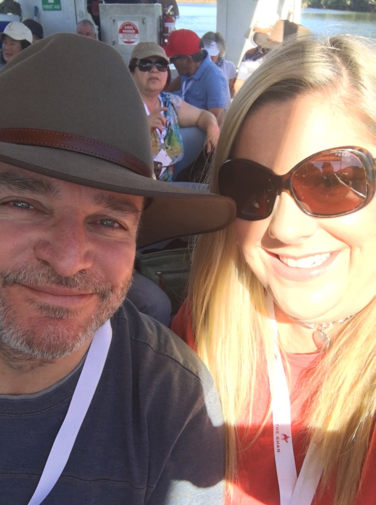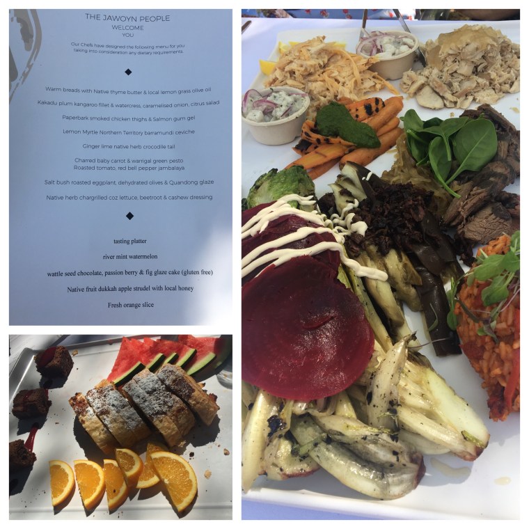 After the boat ride, the whole group sat down to a wonderful luncheon of local bush tucker. Although the food was terrific, I wasn’t thrilled that it was served family-style (and with no serving utensils) and the servers only provided one platter every eight people or so. It wasn’t really enough food and there was this awkward dance of who was going to eat what and some people couldn’t even reach the food at all. At an outdoor lunch with cloth napkins, real china, and formally dressed servers, this didn’t seem commensurate with the occasion but we did get the opportunity to try at least a little of everything. I did take a minute afterwards to approach and compliment the wait staff who did a really tremendous job keeping everyone watered, as it were.