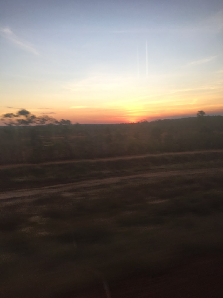 Through our cabin window we saw a bushfire – one of many on this trip, with the difference this time being that there was not only smoke but flames, and the flames were less than 20 yards or so from the tracks! We passed by it so quickly I didn’t get a good photo, but it was a little surprising all the same.
