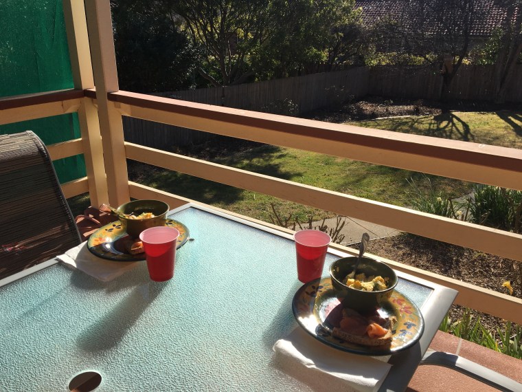 We had about 90 minutes to collect ourselves, rest, and assemble items from our fridge, pantry, and wine cabinet for our kind and generous Australian next-door neighbors, and then we went over to eat dinner with them. Conversation and laughter with two of the people who have been the absolute nicest to us here alongside fish pie, steamed vegetables, and apple berry crumble with lemon custard warmed my soul. So much better than take-away in a packed-out house our last night, as we were too tired to go out ourselves.