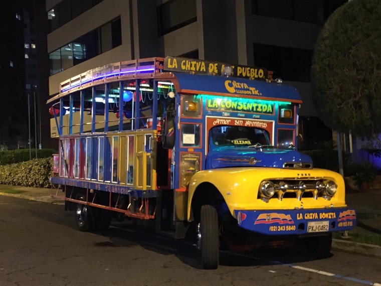 A chiva (goat) is a party bus common in Ecuador, Colombia, and Panamá. They are festooned with decorations and bright colors, and although they technically started off as a method of rural highlands transport for passengers and animals, they have evolved into a moving fiesta complete with flashing lights and a DJ or live band. They are apparently especially common in Quito during December due to patriotic holidays.