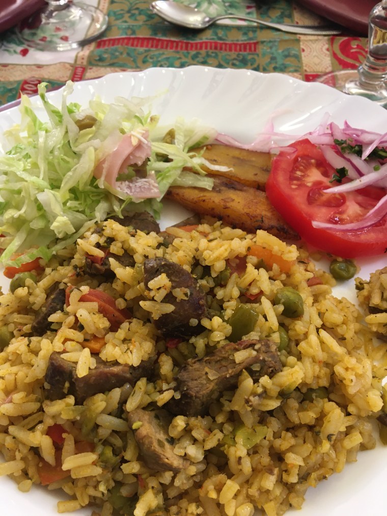Carne con arroz, ensalada y plátanos
