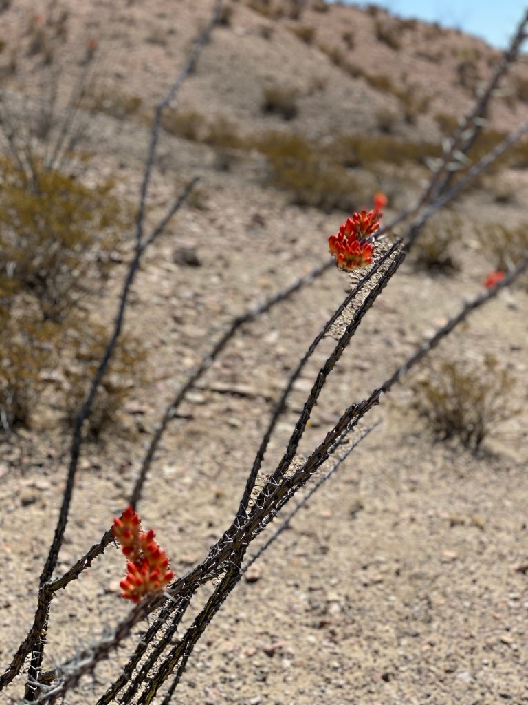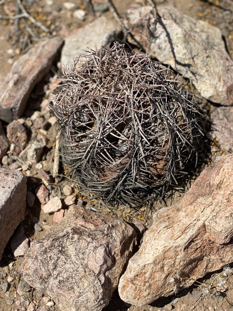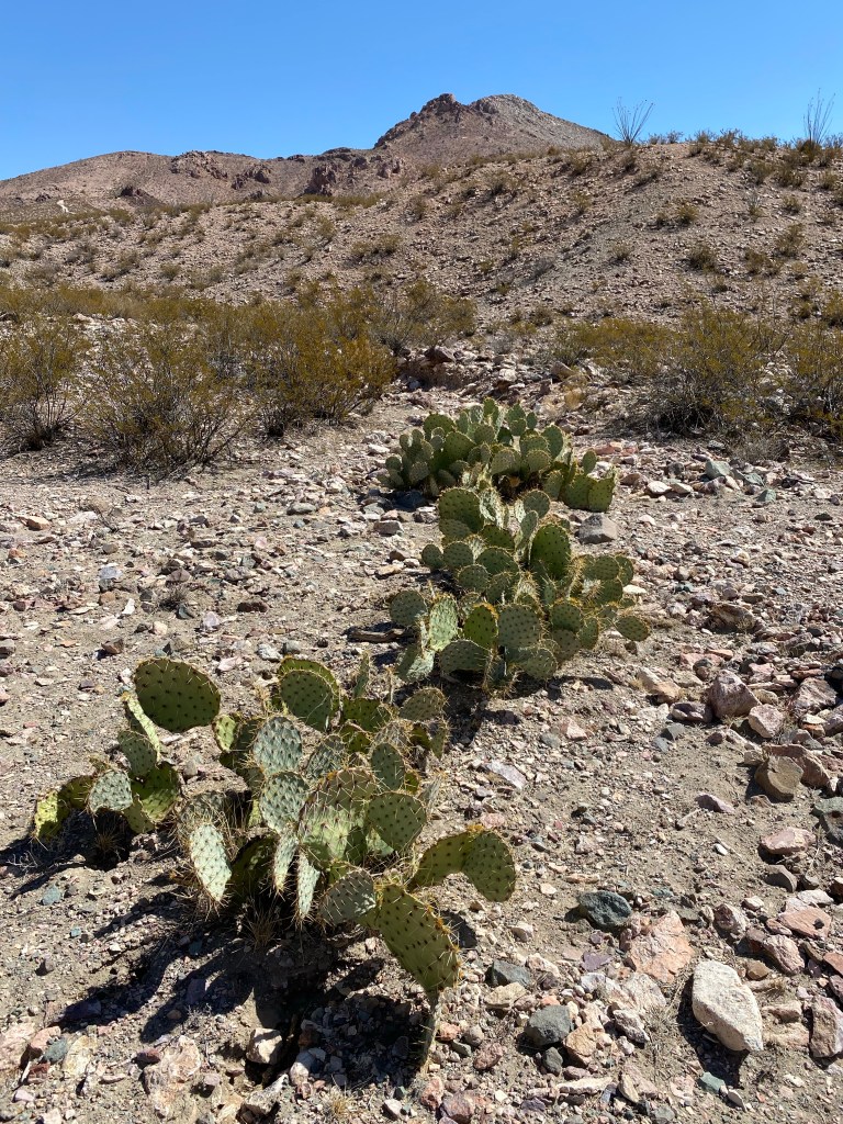 The sun beat down on me and I felt immense gratitude for remembering to wear a hat. I stopped frequently in any shade I could find, and took pictures of abundant desert life. Two lizards scampered under rocks at my approach, and the occasional butterfly flitted nearby. Some kind of hawk circled high overhead. I called it after less than 90 minutes and headed back to my car, somewhat surprised I couldn’t stay out there longer, but realizing it would be better to turn around and head back to save some energy and not completely wipe myself out first thing in the morning.