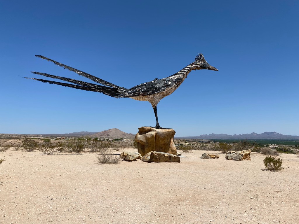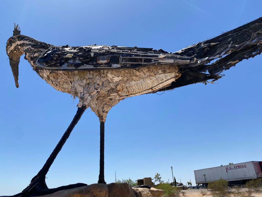 I went next to a scenic overlook off the freeway nearby to see something Google Maps was calling the “Recycled Roadrunner Sculpture.” I found it at a rest stop, perched high on a hill and surveying interstate 10 like it was calculating its chances of breaking into a run at any moment.