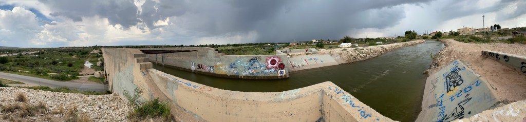 When we arrived in Carlsbad, we checked into our hotel and decided to head to the flume. I still didn’t really get what a flume was (I was picturing orange flames and smoke plumes for some very strange reason) but I knew it was going to start raining soon and I wanted to see it before that. (I’ve since come to understand that a flume is like a raised aqueduct, but rather than just letting water flow through it like an aqueduct, it is engineered to channel the water through and keep the flow at a certain level. I read it’s something to do with an open declined gravity chute, or something, but I’ll leave that to the engineers.)