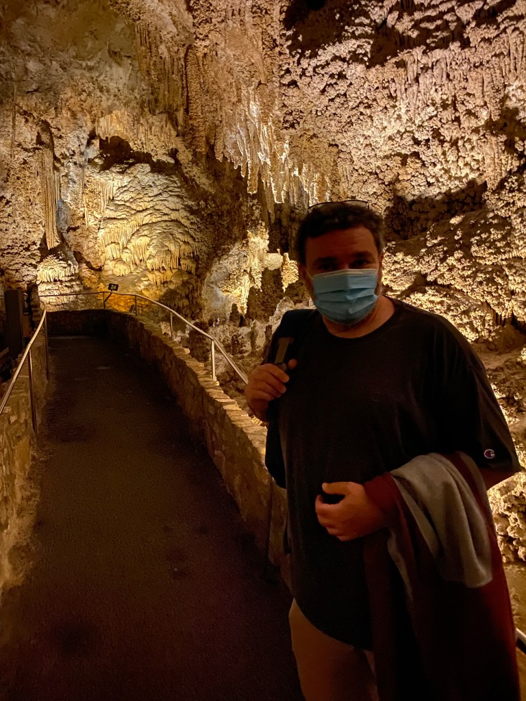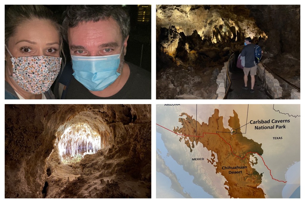 Our second day in Carlsbad we headed to the Carlsbad Caverns National Park, where our annual national parks pass excepted us both from paying the $15 entrance fee, which was awesome. Because it had recently rained heavily, we decided not to take the long, slippery hike into the caves and instead went down in the elevator; although masks were required, not everyone was wearing one (or wearing it properly) and I didn’t relish the idea of packing myself onto a crowded, narrow trail with other people exerting themselves as we all tried not to slip and knock each other down.