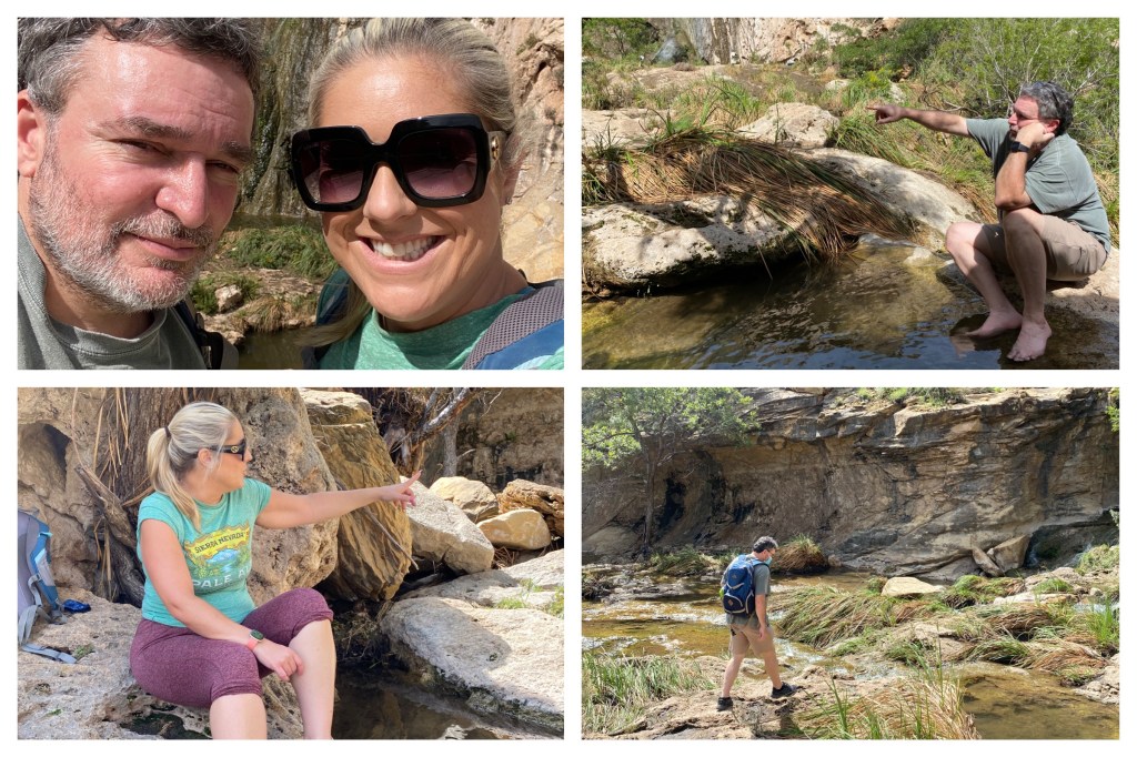 I’m not sure exactly how this river manages to cross itself – maybe it has to do with the magical science of flumes? – but it certainly did seem to be the case. Below you can see it behind me, and then also in front of V as he looks down at it. Trust me, it’s the same river. And there actually isn’t anything magical about it, but it’s still a cool oddity we enjoyed. You can read more about the history of the Pecos Flume at this linked Condé Nast Traveler article.