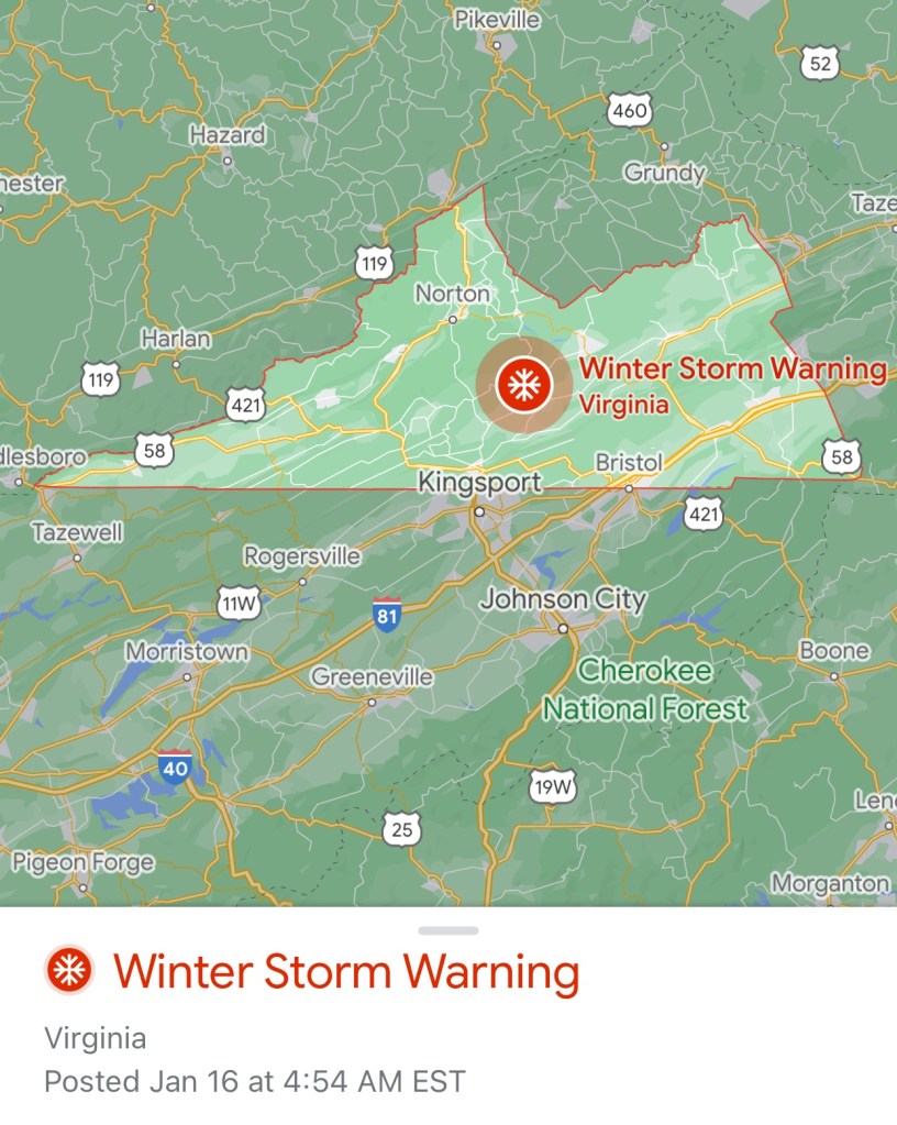 And sure enough, when we awoke the next morning, the weather on the interstate we would need to travel between Tennessee and Virginia was so dire – with heavy snowfall accumulation, jackknifed big rigs causing motor vehicle accidents in their wake, and Virginia state troopers taking to social media to ask the public to stay off the roads unless they had an emergency need to travel, that V got on the phone. A few moments later, our hotel reservation in Virginia was postponed by a day, our hotel stay in Knoxville was extended another night, and we stretched our toes in the warm sheets and watched The Weather Channel talk about Winter Storm Izzy’s 50 mph winds like good southerners. V texted his daughter in North Carolina about having extra batteries on hand as she posted pictures on Instagram walking with her boyfriend in the snow. For travelers the weather was an inconvenience, but for those comfortably ensconced at home and with their electricity still on, a snow day was a treat!