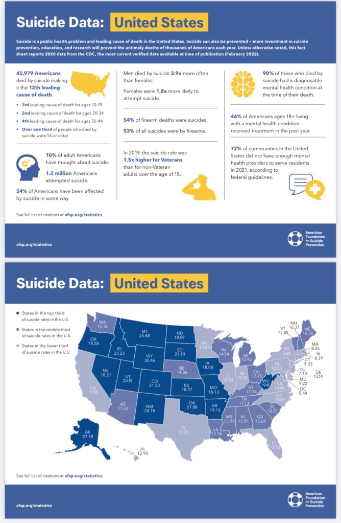 September is National Suicide Prevention Awareness Month in the United States, and September 4-10, 2022 marked National Suicide Prevention Week, an annual campaign to educate the public and promote increased awareness about suicide. On a personal note, one year ago this month an old friend and someone important to me took his own life, so I’d like to use this post to discuss suicide awareness. Suicide is a heavily stigmatized topic many people avoid and consider taboo. But it’s not a contagious disease. It touches so many of us and is getting harder to ignore.