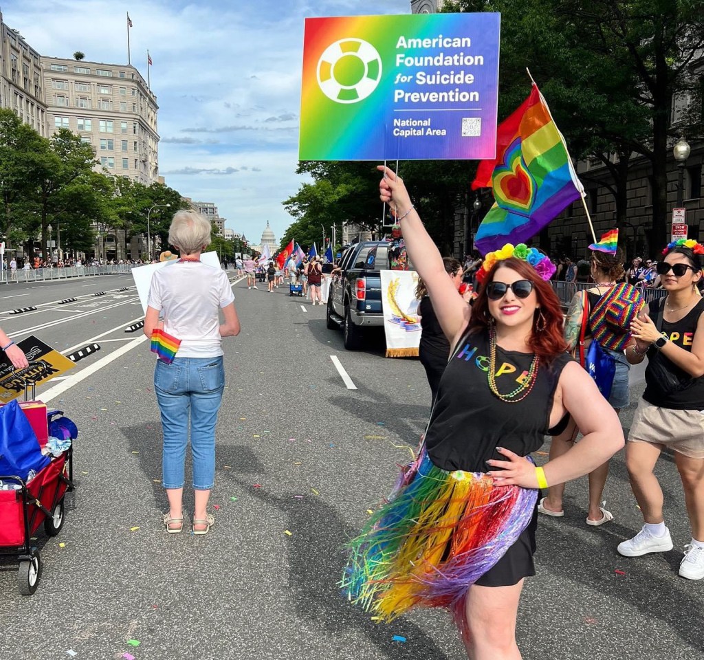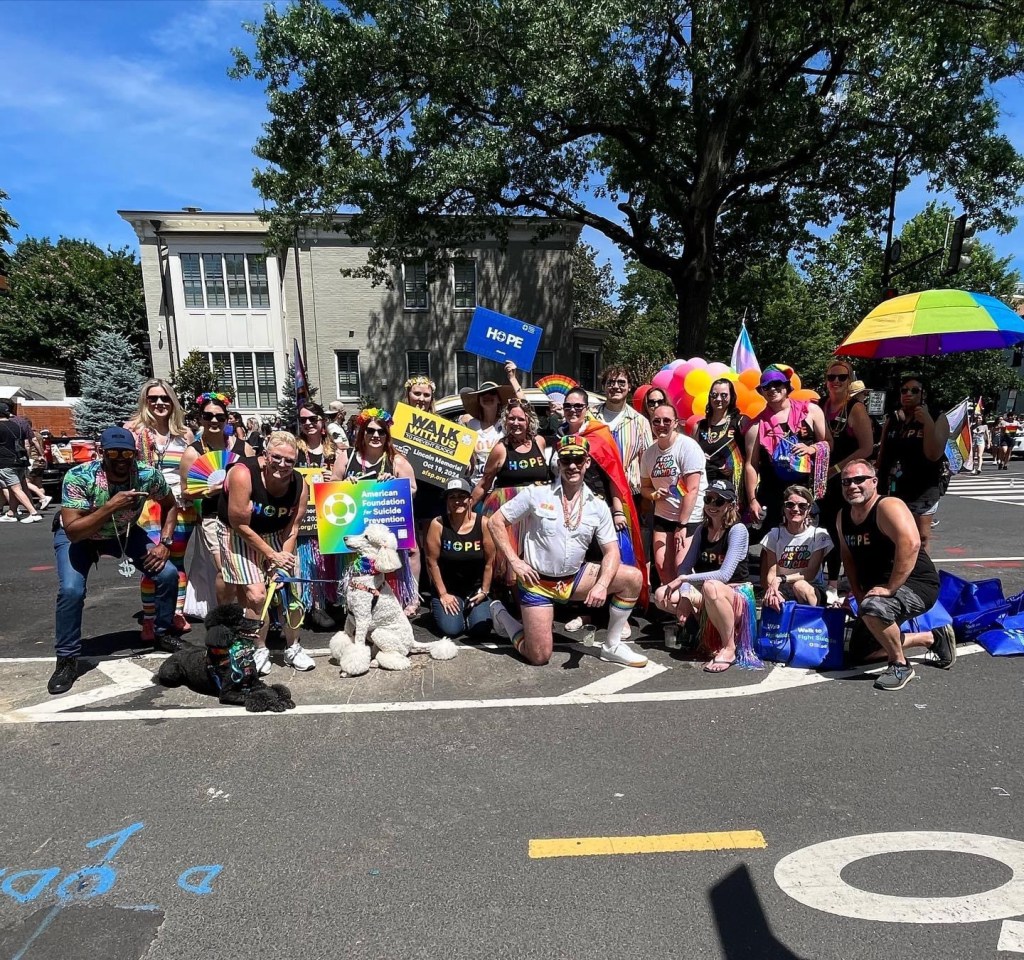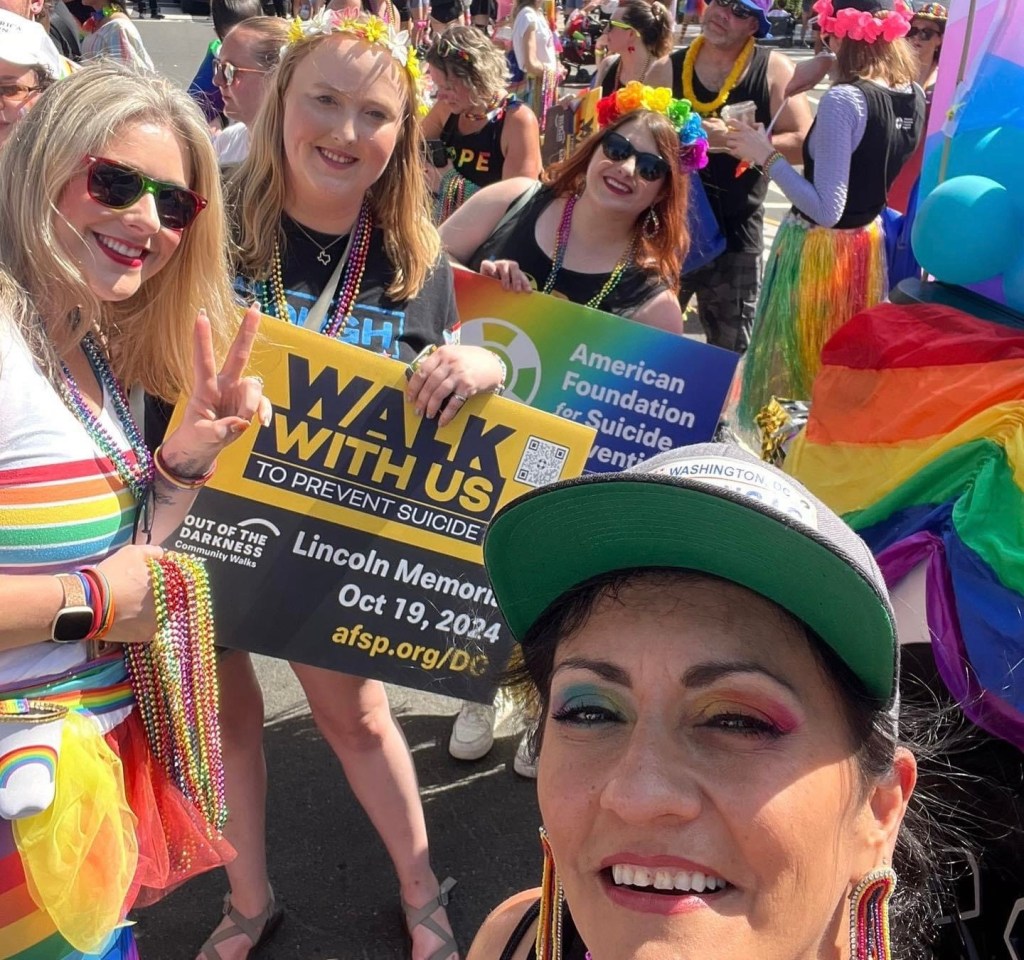 And I did eventually get to the place where I wanted to do volunteer work in the community on the suicide prevention side. So I felt happy when I received an invitation in June to help decorate the AFSP float for the Capital Pride Parade, and then walk in the parade. The first DC parade was held in 1975 – almost 50 years ago.