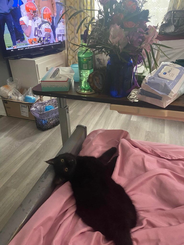 A nurse told us the kitten, Caroline, was named for an elderly patient, Carole, who had previously lived in L’s room. In fact, the day L moved into the room, I noticed Carole’s name still on the decorated whiteboard outside the door. “Carole died of brain cancer,” the nurse said. “Many years earlier, their only son had also died of brain cancer. But he had been a young man in his 30s.”