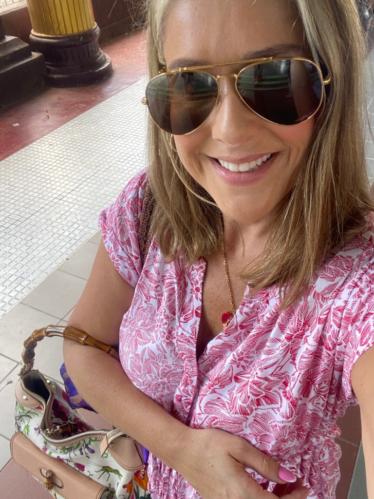 Regrettably, I accidentally sweated on the vachetta of my vintage Gucci purse from the 1990s and I watched in disbelief as small discoloration marks appeared on the pristine raw leather. I hadn’t realized that would happen or I would have carried a more summer-proof bag. Despite a small walkway-style mat leading around the pagoda, my bare feet were getting scorched by the hot marble and I hopped from one odd shady patch to another.