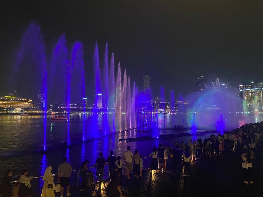 The river cruise tour included our own bus and guide, and a trip to the Singapore Flyer, the Spectra Light and Water Show at the Marina Bay Sands, and the Garden Rhapsody Light Show at the Gardens by the Bay. It was a lot of fun, and a few people capped it off with a visit to the Lau Pa Sat food market. I was tired by 10 p.m. and opted for room service instead.
