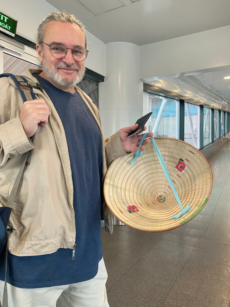 V with his nón lá (Vietnam’s traditional conical hat, handcrafted from palm leaves over a bamboo frame) about to board our flight from Hanoi to Da Nang. Worn for centuries, the nón lá protects against sun and rain and remains a graceful symbol of Vietnamese culture and daily life. V picked it up with some bargaining on Hanoi’s busy streets.